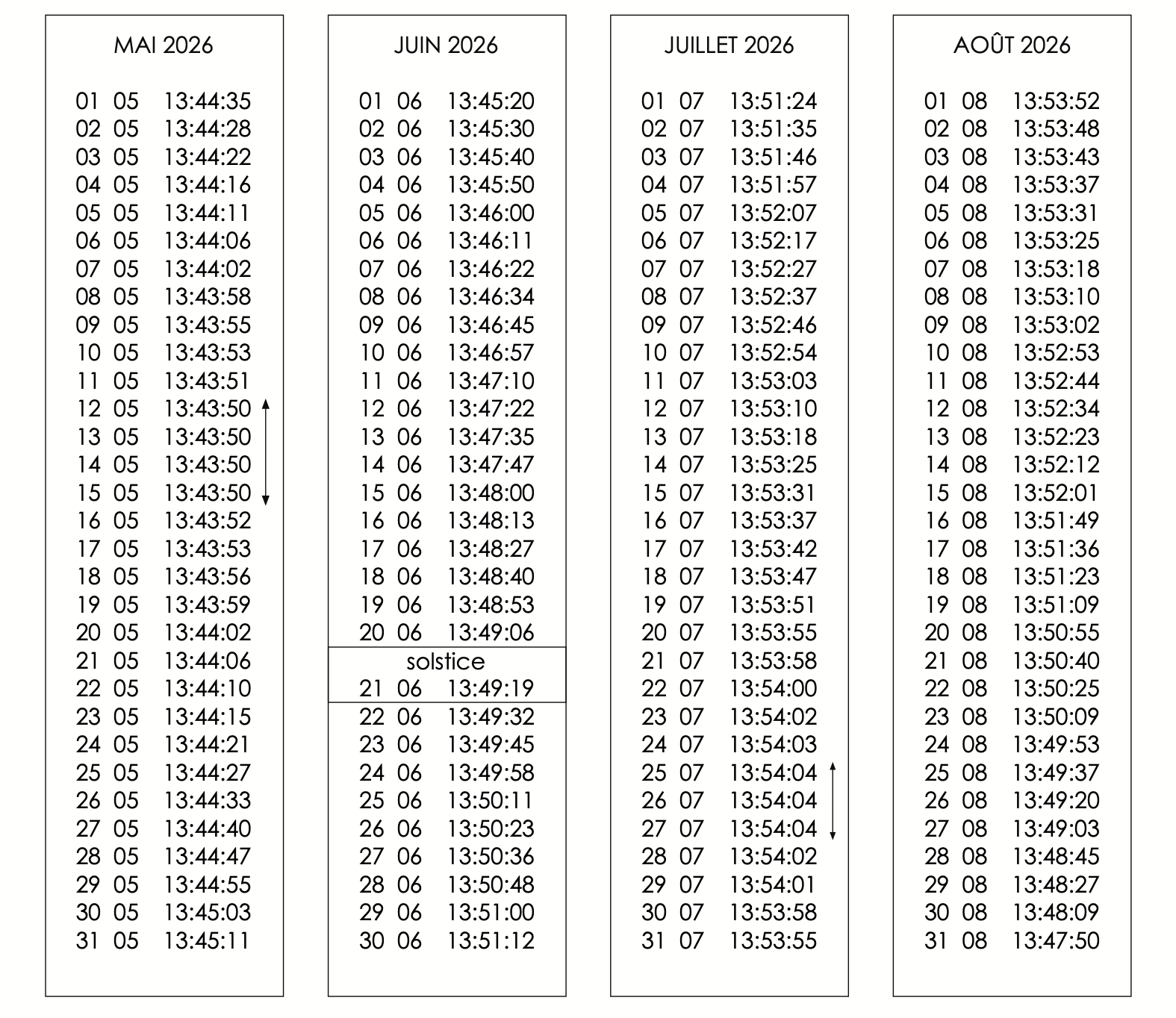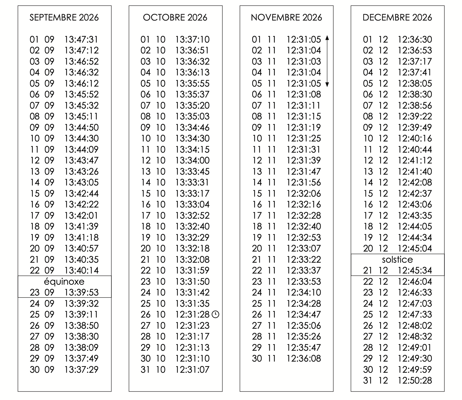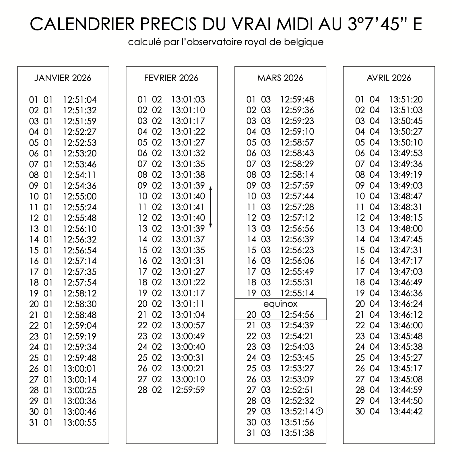 Les horaires varient d'un jour à l'autre et d'une année à l'autre. raison : l'orbite de la Terre n'est pas exactement circulaire mais légèrement elliptique et le soleil se déplace le long de l'écliptique au cours de l'année et non le long de l'équateur céleste. Ces effets font apparaître le soleil pour décrire une figure en "8" (un analemme) avec une déviation de -14'14" à +16'26"